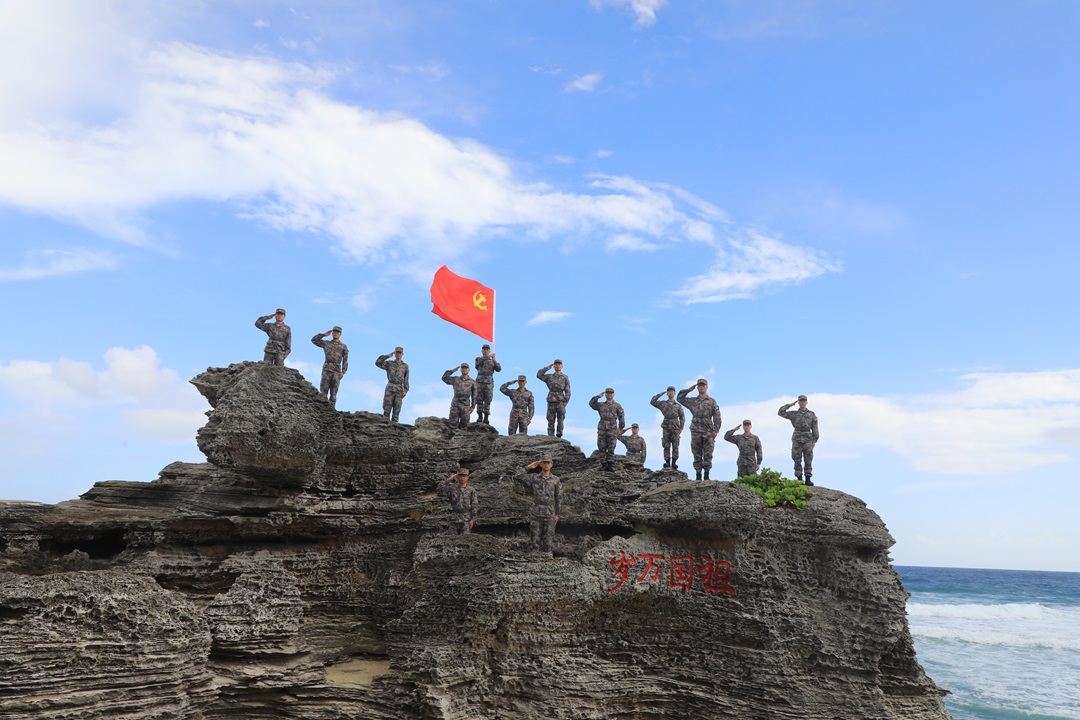 清晨,站在中建島瞭望哨上,一面巨幅黨旗和國(guó)旗,以及“祖國(guó)萬(wàn)歲”“黨徽永耀”8個(gè)大字躍入眼簾。這幅畫(huà)卷是官兵們用島上特有的植物——海馬草種植出來(lái)的。這8個(gè)字,是島上官兵的信仰旗幟和精神豐碑。同時(shí),海馬草具有很好的固水、固沙作用,也為防止島上水土流失,建設(shè)綠色海島起到重要作用。