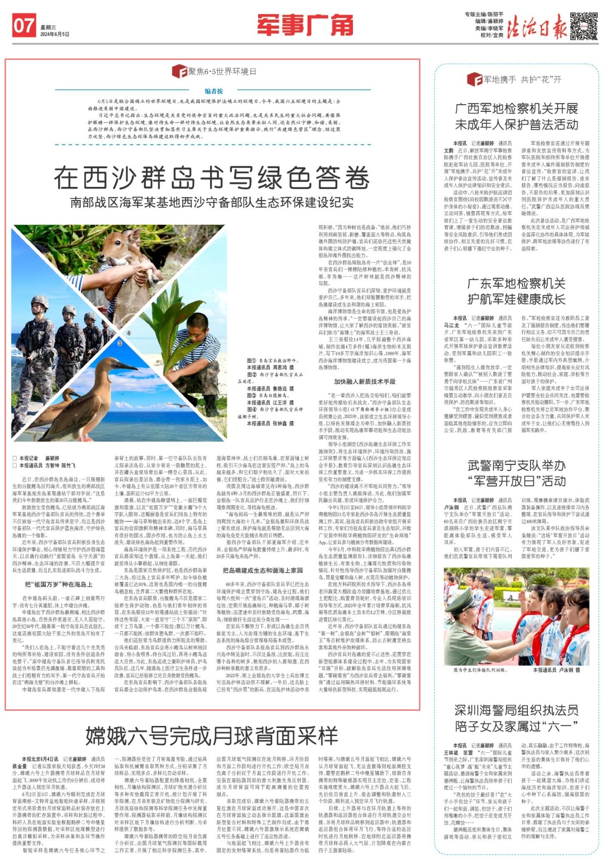 “西沙的建設(shè)離不開(kāi)軍地共同努力?!鳖I(lǐng)導(dǎo)小組主要負(fù)責(zé)人姚振濤說(shuō),為此,他們加強(qiáng)軍民融合共建,形成環(huán)境保護(hù)合力。