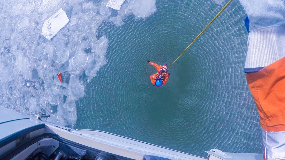 圖為海軍航空兵某部搜救員張闖首次進行冰海救援。
