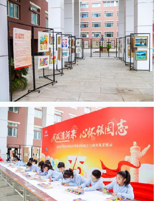 戶外展區(qū),“童心繪盛世,丹青耀中華”書(shū)畫(huà)作品展率先引爆全場(chǎng)。國(guó)畫(huà)、油畫(huà)、素描、彩鉛、漫畫(huà)……一幅幅由學(xué)生精心創(chuàng)作的作品琳瑯滿目,色彩斑斕,每一筆都透露出孩子們對(duì)祖國(guó)的深情厚意和對(duì)美好生活的無(wú)限憧憬。特別是那幅由16位學(xué)生共同手繪的7.5米長(zhǎng)的巨型畫(huà)卷,如同絢麗的彩虹,將孩子們的夢(mèng)想與祖國(guó)的未來(lái)緊緊相連。
