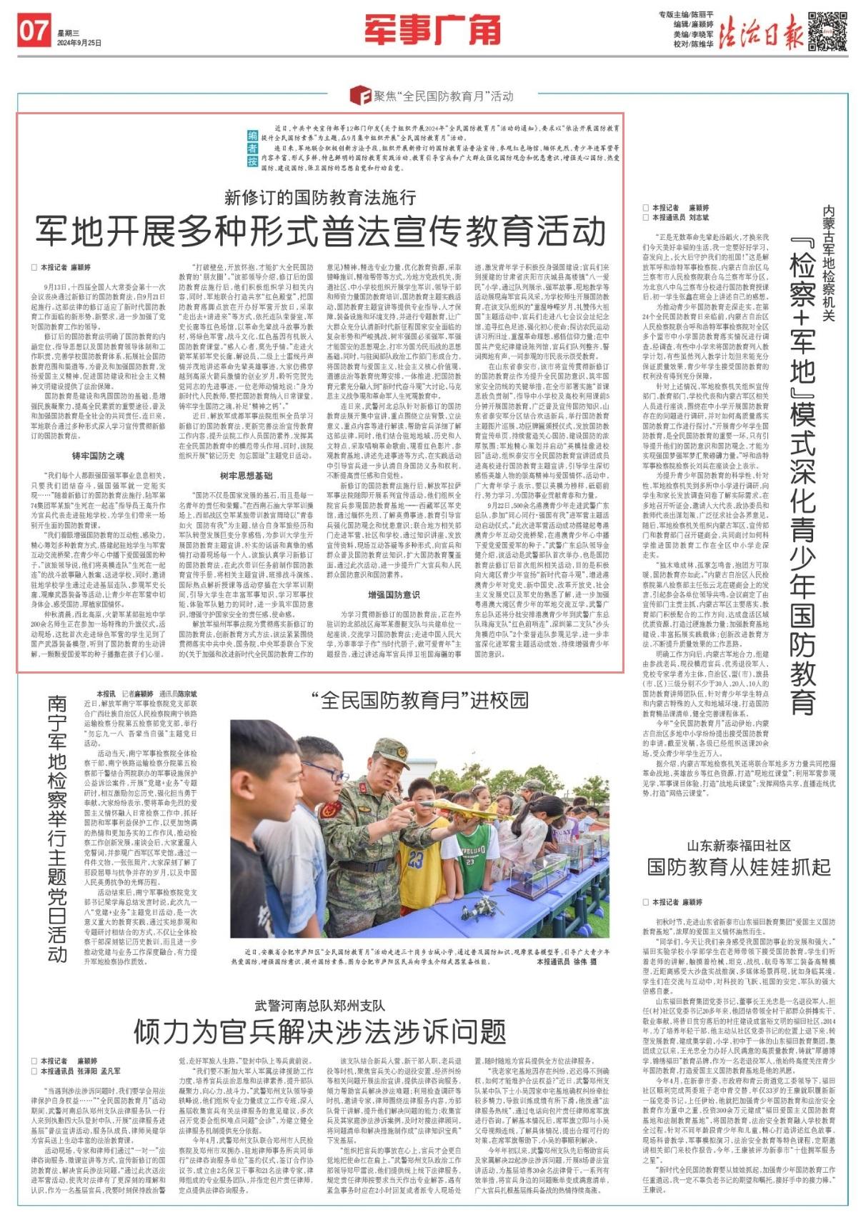 國防教育是建設(shè)和鞏固國防的基礎(chǔ),是增強民族凝聚力、提高全民素質(zhì)的重要途徑,普及和加強國防教育是全社會的共同責任。連日來,軍地聯(lián)合通過多種形式深入學習宣傳貫徹新修訂的國防教育法。