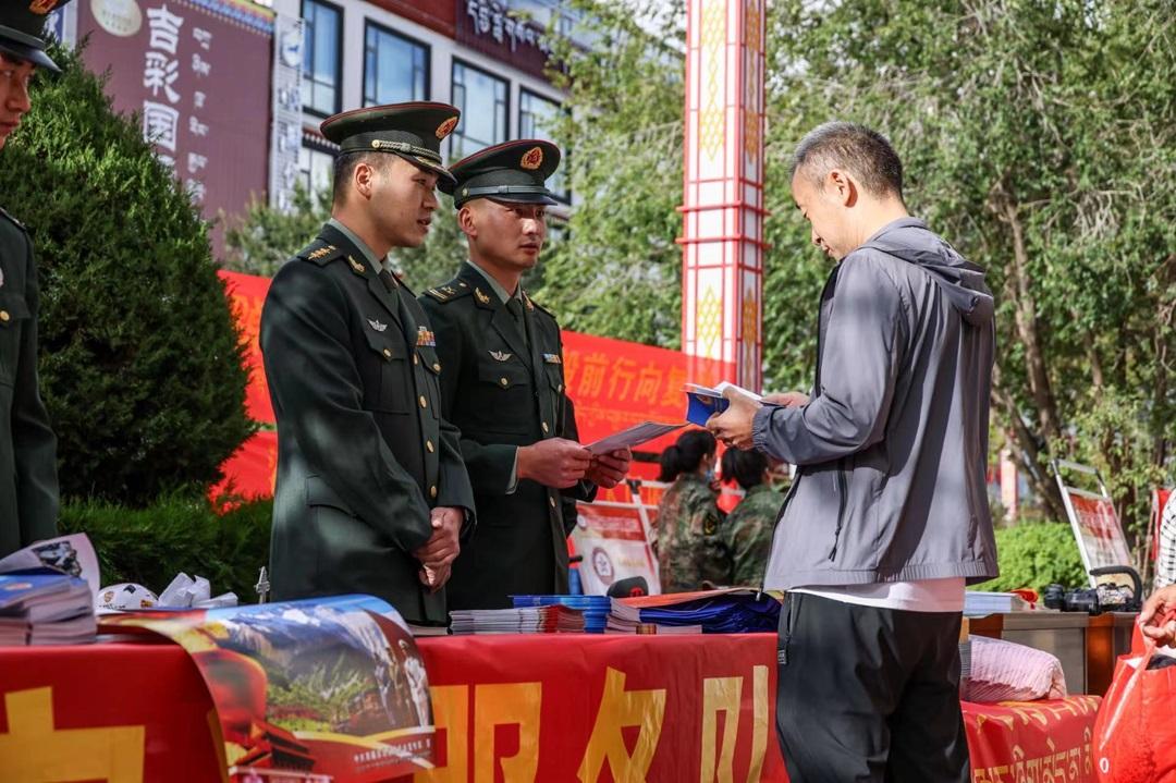 圖為解放軍拉薩軍事法院和西藏拉薩警備區(qū)官兵向群眾宣傳國防知識。黎遠華 攝