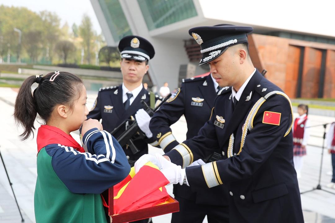 升旗儀式開始前,國旗依次傳遞至中共黨員、共青團員、少先隊員代表手上,并由少先隊員代表將國旗傳遞給儀仗隊護旗、升旗。