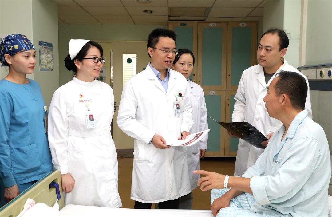 圖為解放軍總醫(yī)院第四醫(yī)學(xué)中心消化內(nèi)科陳超主任帶領(lǐng)醫(yī)護(hù)人員查看運用“超級微創(chuàng)手術(shù)”切除胃部腫物的患者,手術(shù)后該患者恢復(fù)良好,不久就可以出院。鞠文富 攝