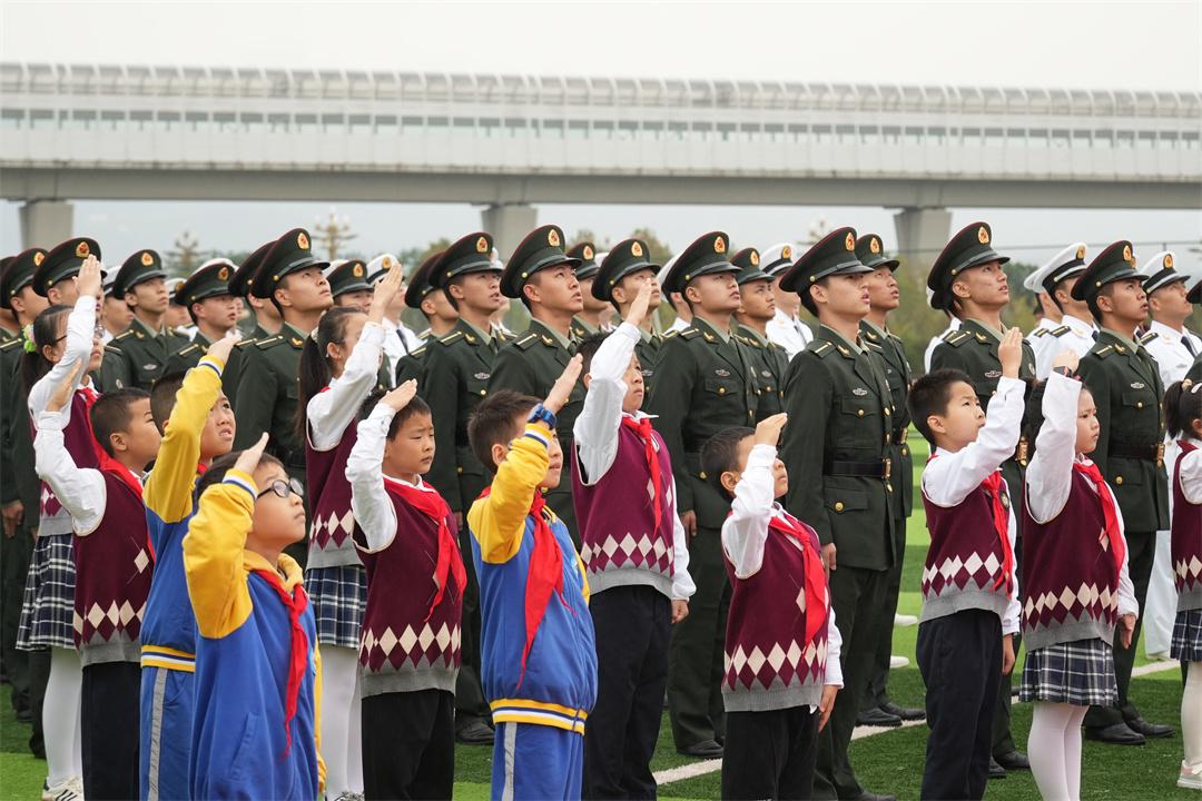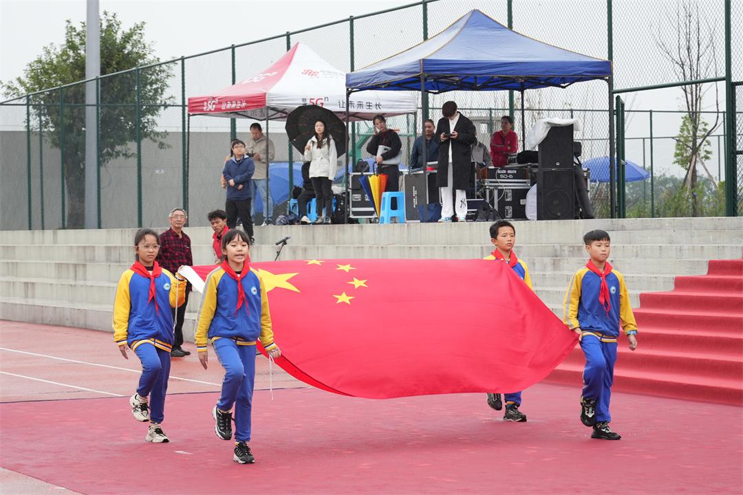 升旗儀式開始前,五星紅旗由少先隊員代表組成的“紅領(lǐng)巾護旗手”方隊傳遞至由航天科技集團七院重慶航天職業(yè)技術(shù)學(xué)院共青團員軍士生組成的國旗護衛(wèi)隊。伴隨著雄壯激昂的國歌,鮮艷的五星紅旗冉冉升起。