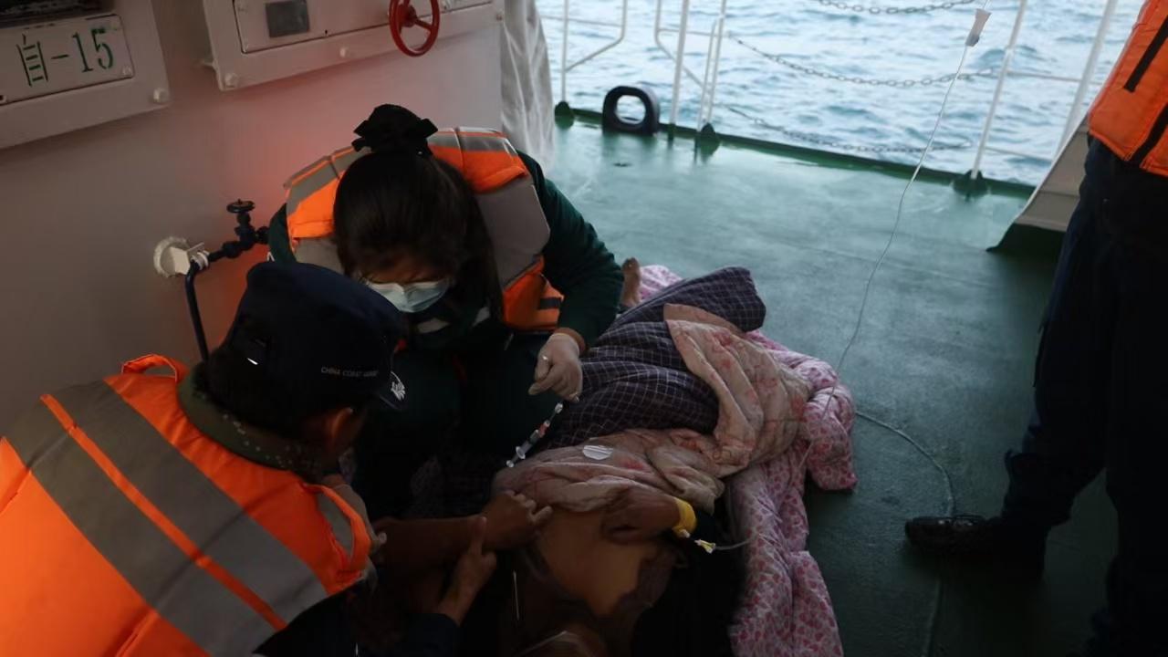 接到報(bào)警后,威海海警局迅速調(diào)派白石艇進(jìn)行緊急備勤備航,并與當(dāng)?shù)?20急救中心取得聯(lián)系。6時(shí)10分,白石艇與事發(fā)船只會(huì)合。此時(shí),早已穿戴好防護(hù)服、佩戴好防毒面具的海警執(zhí)法員和醫(yī)護(hù)人員登上事發(fā)船只展開(kāi)救援。
