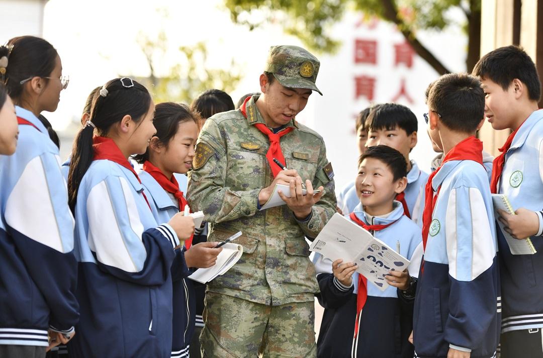 圖為在肥東縣長(zhǎng)臨河學(xué)校中心小學(xué),某部指導(dǎo)員魏力源給孩子們寫寄語(yǔ)。