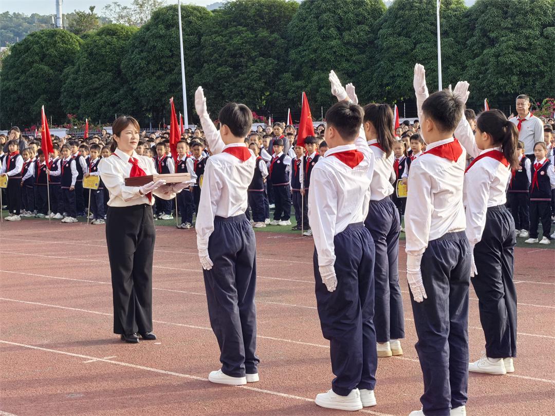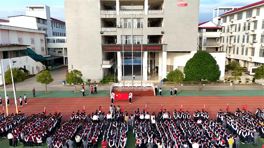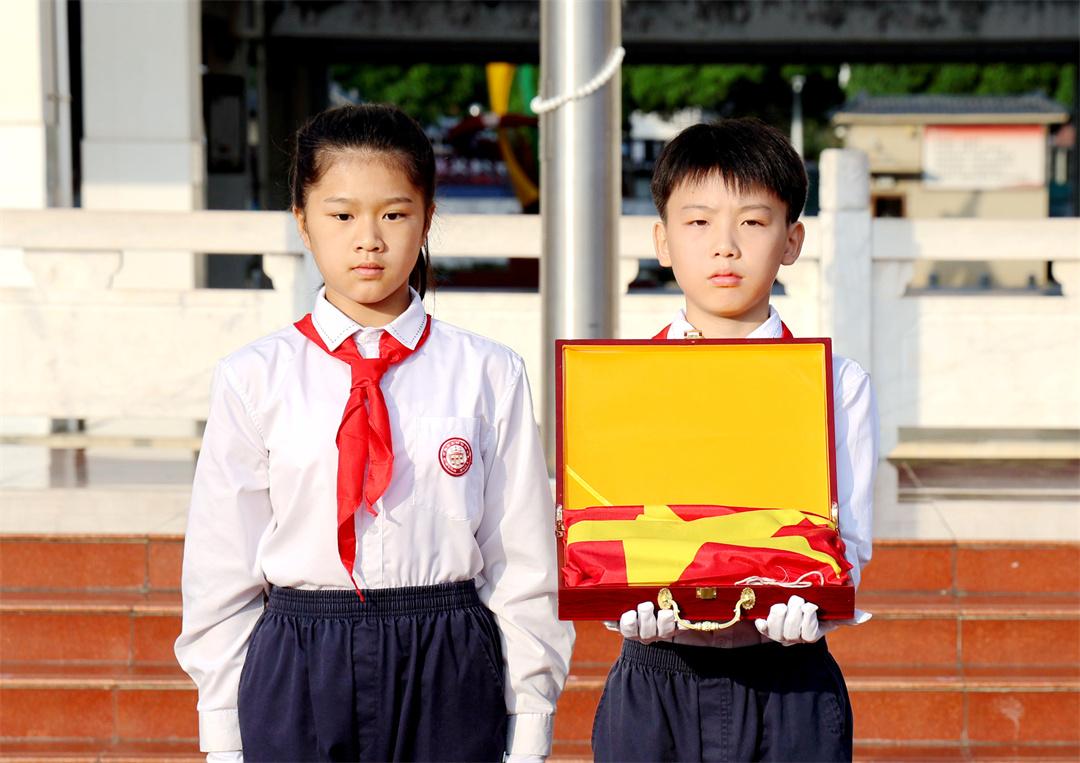 活動當(dāng)天,隨神舟十八號載人飛船進(jìn)入中國空間站并隨神舟十七號載人飛船返回地面的國旗在百色市第一小學(xué)進(jìn)行傳遞?;顒又?,廣西少先隊(duì)總輔導(dǎo)員代表將國旗傳遞到百色市少先隊(duì)員代表手中。少先隊(duì)員現(xiàn)場展示國旗后舉行了莊嚴(yán)的升國旗儀式。少先隊(duì)員代表在國旗下表達(dá)了對祖國的熱愛和對中國航天事業(yè)的向往,表示將把這份熱愛和期許化作實(shí)際行動,傳承紅色基因,刻苦學(xué)習(xí)、不斷進(jìn)取,努力成長為堪當(dāng)民族復(fù)興重任的時代新人。