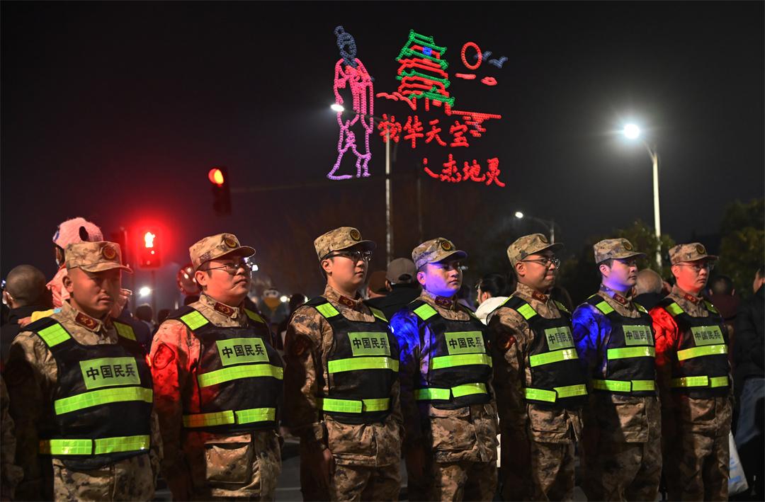 隨著夜幕降臨,活動(dòng)周邊區(qū)域人流、車流驟增。民兵們有的化身貼心引導(dǎo)員,耐心為游客提供引導(dǎo)咨詢;有的疏導(dǎo)人流,用有力的雙手和耐心的勸導(dǎo),確保人群有序流動(dòng)。在重要路口和通道,民兵組成人墻引導(dǎo)人群分批通過,避免擁堵和踩踏事故發(fā)生。