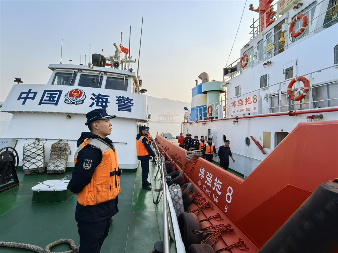 圖為海警執(zhí)法員登臨地方船舶實施檢查。