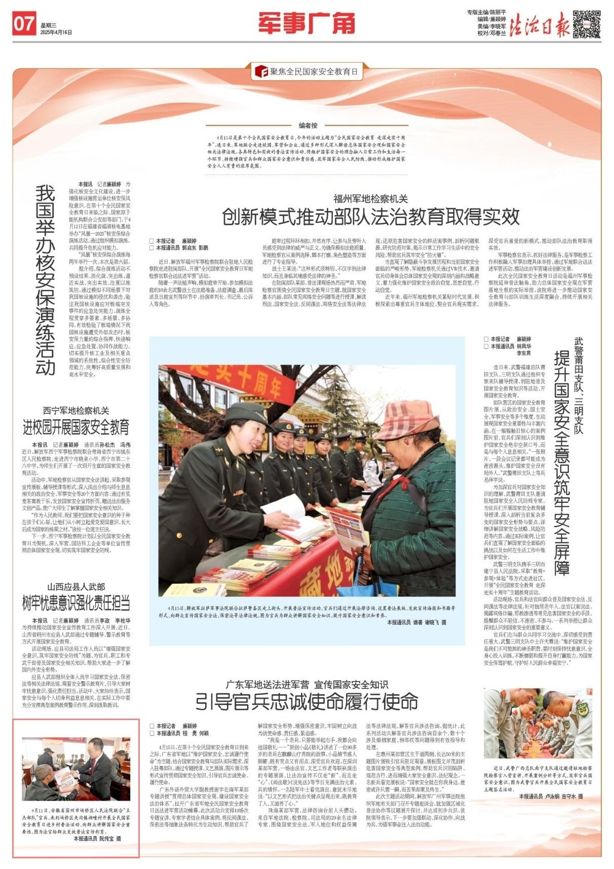 4月11日,安徽省宿州市埇橋區(qū)人民法院聯(lián)合“王杰部隊”官兵,來到埇橋區(qū)夾溝鎮(zhèn)湖疃村開展全民國家安全教育日進鄉(xiāng)村普法活動,向群眾講解國家安全重要性。