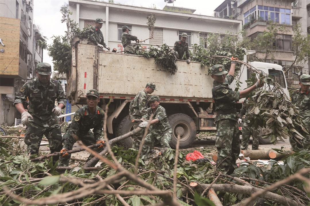 “紅色前哨連”聞令而動,官兵們在齊腰深的海水中摸索前行,赤腳涉險1公里抵達災區(qū)。面對情侶路被海水倒灌、樹木橫阻的險情,60余名官兵連續(xù)3天每天奮戰(zhàn)10小時,用斧頭劈開倒伏樹干,徒手搬運數(shù)百斤樹枝,清理被淹車輛十余臺,轉(zhuǎn)移群眾30余人,疏通情侶南路3.7公里。