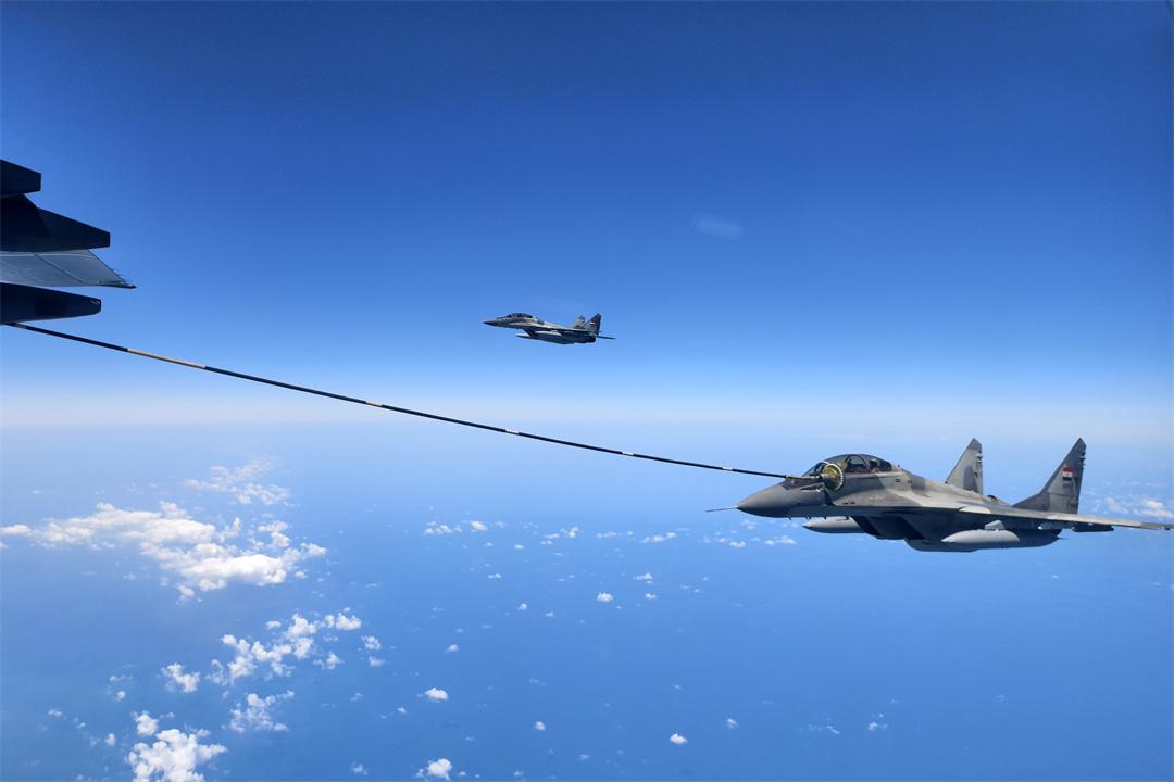 圖為4月28日,參加中埃“文明之鷹-2025”空軍聯(lián)合訓練的中國空軍運油-20飛機和埃及空軍米格-29飛機進行空中加油訓練。余紅春 攝