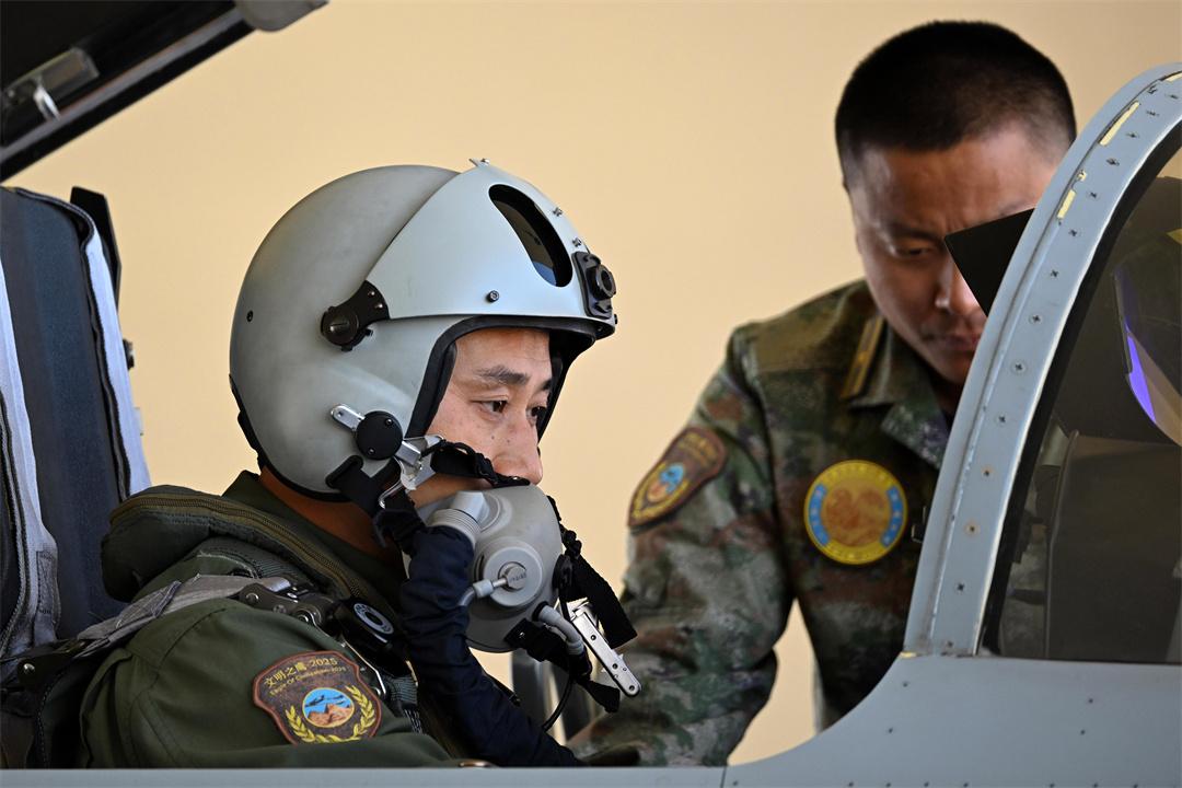 圖為4月19日,埃及空軍某基地,參加中?!拔拿髦?2025”空軍聯(lián)合訓練的中國空軍飛行員進行起飛前檢查。余紅春 攝