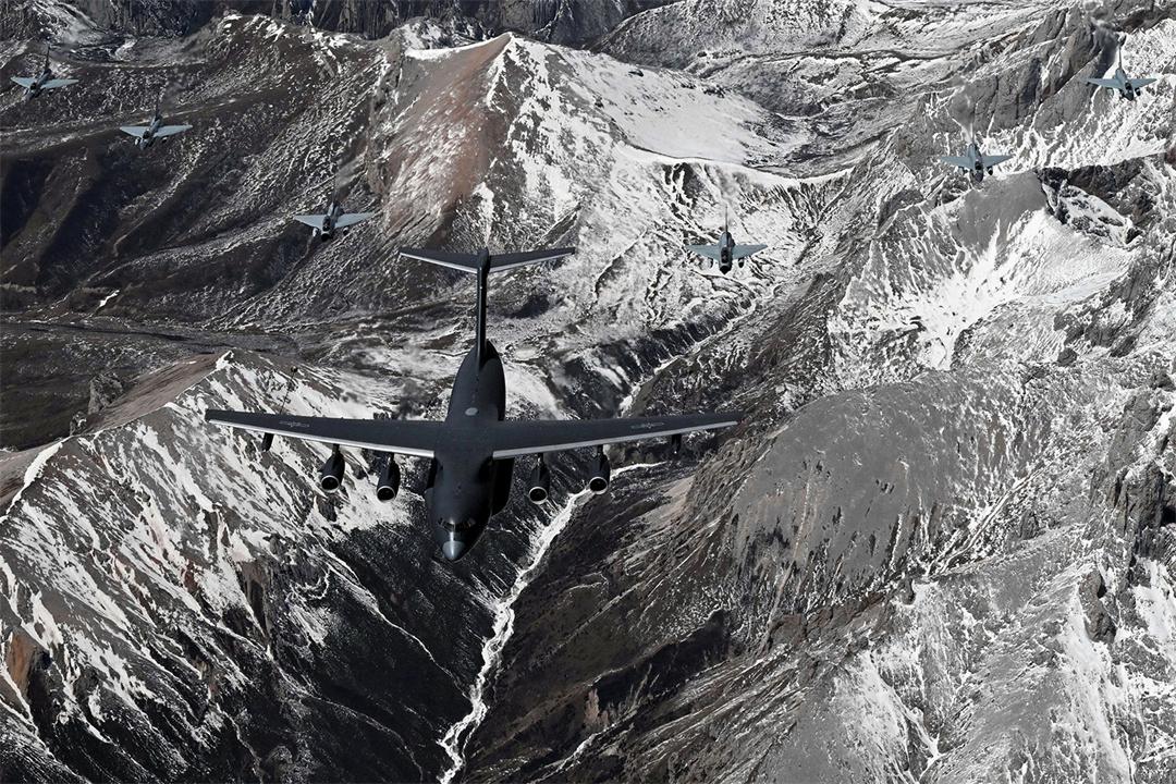 圖為4月12日,中國境內(nèi),參加中?!拔拿髦?2025”空軍聯(lián)合訓練的運油-20和殲-10戰(zhàn)機編隊飛躍雪山。余紅春 攝