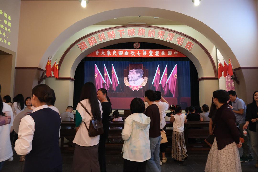中國共產(chǎn)黨第七次全國代表大會會場在展廳復(fù)原——紅色條幅上寫著“在毛澤東的旗幟下勝利前進”,投票箱、陜甘寧邊區(qū)政府黨團委員會獻給中共七大的賀幛等也同時展出,毛澤東的代表證也出現(xiàn)在“會場”。紅色封皮內(nèi)左頁上方,兩行橫印“中國共產(chǎn)黨第七次全國代表大會”,下方豎印“代表證”,旁邊是手寫的序列號;右頁上方橫印座號、姓名和注意事項。當時,毛澤東坐在1排7號。