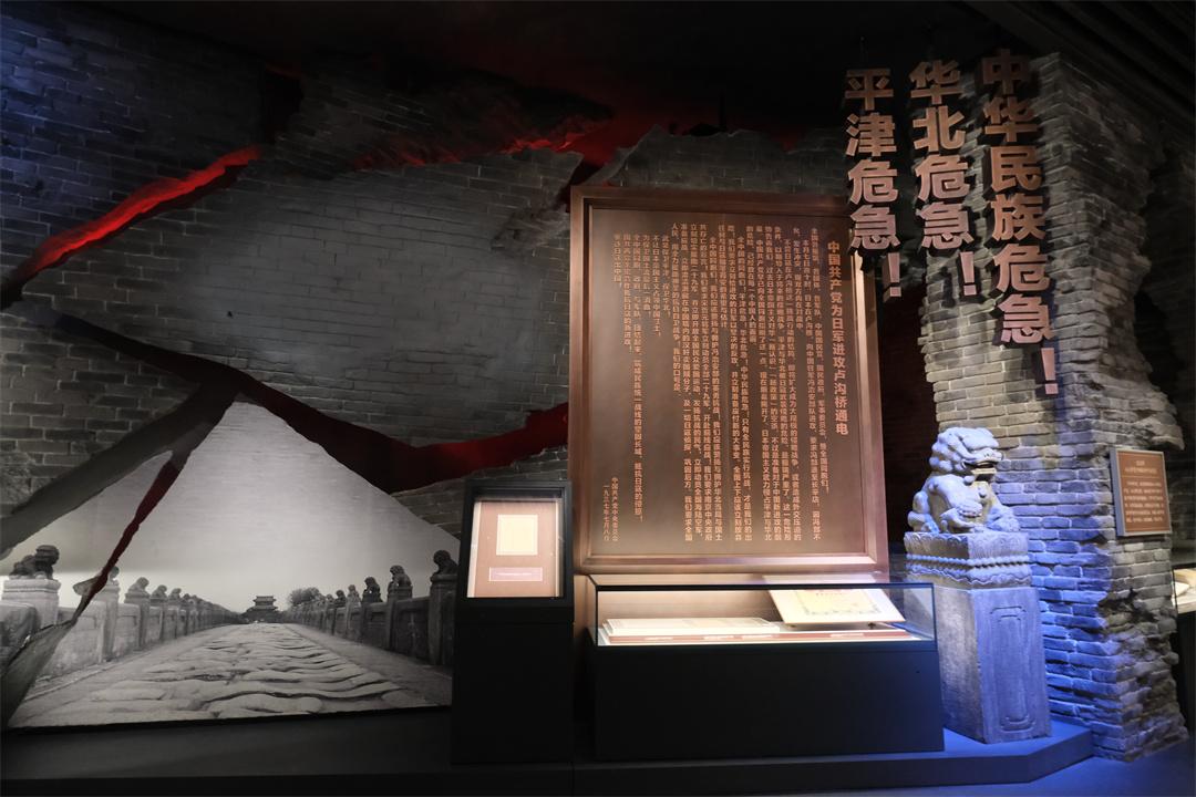 “全中國的同胞們!平津危急!華北危急!中華民族危急!只有全民族實行抗戰(zhàn),才是我們的出路!”一則《中國共產(chǎn)黨為日軍進攻盧溝橋通電》原文被放大并“搬”上展墻,一行行大字尤為醒目,字字千鈞。主題展覽第二部分“七七事變”場景,瞬間將觀眾拉回88年前的盧溝橋畔,也是很多觀眾反饋印象最深刻的場景之一。