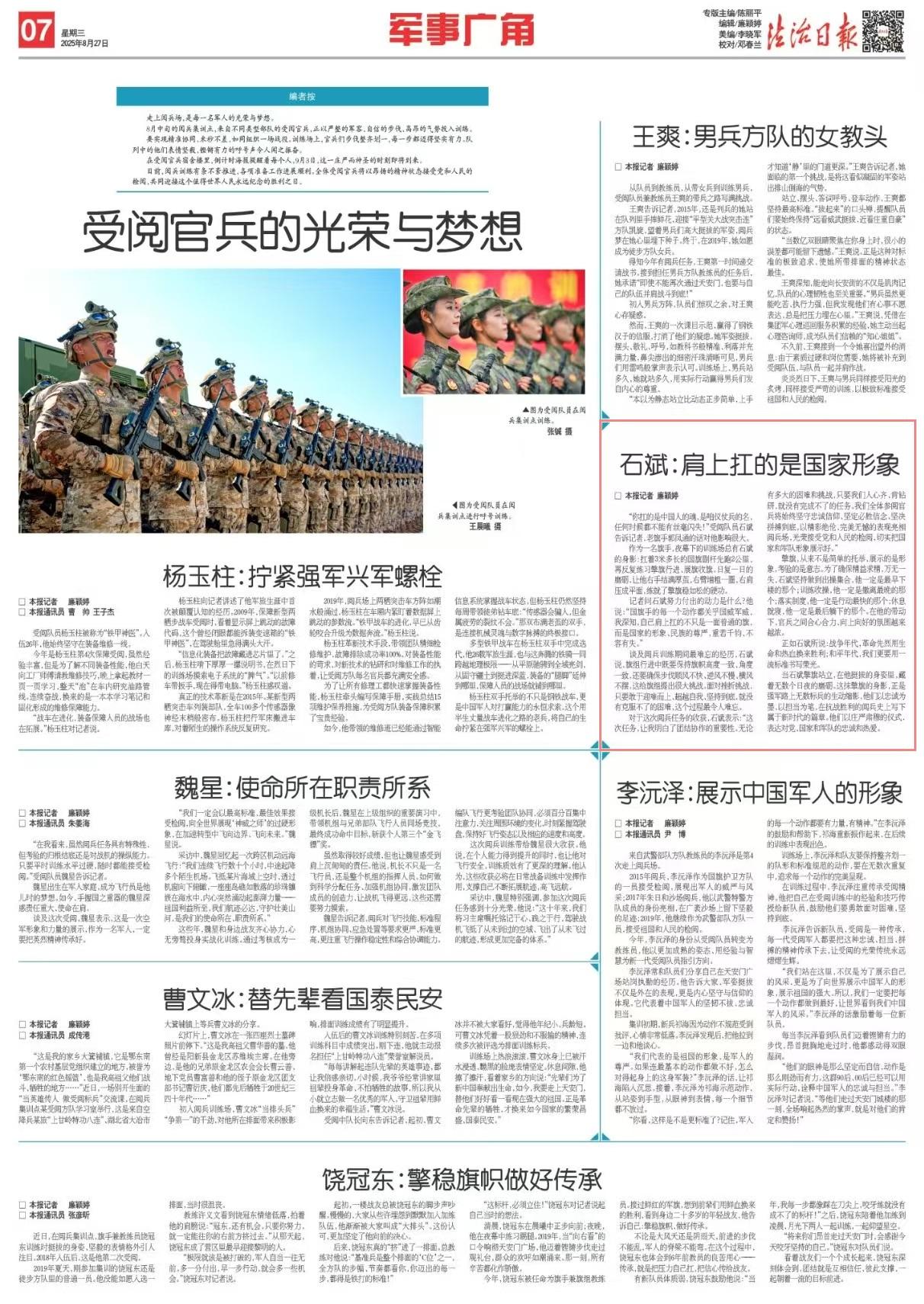 記者問石斌努力付出的動(dòng)力是什么?他說(shuō):“國(guó)旗手的每一個(gè)動(dòng)作都關(guān)乎國(guó)威軍威,我深知,自己肩上扛的不只是一面普通的旗,而是國(guó)家的形象、民族的尊嚴(yán),重若千鈞、不容有失?!?/p>