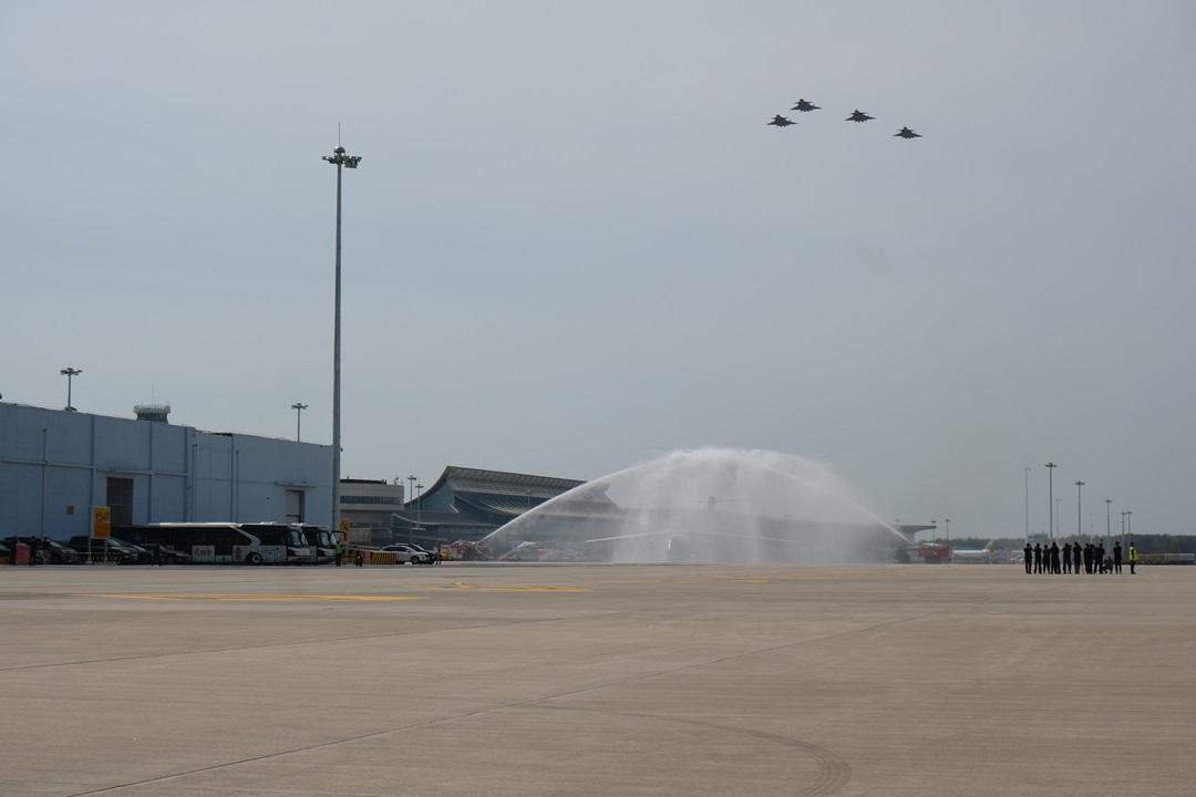 10時57分,空軍運-20專機緩緩降落在沈陽桃仙國際機場。專機進入中國領(lǐng)空后,空軍4架殲-20戰(zhàn)斗機護航,運-20使用“跨江50”呼號,4架殲-20使用“凱旋”呼號,“雙20”同框向志愿軍烈士致以崇高敬意?!拔鍣C編隊”在機場上空通場,桃仙國際機場以“過水門”航空最高禮儀迎接志愿軍烈士遺骸回家。