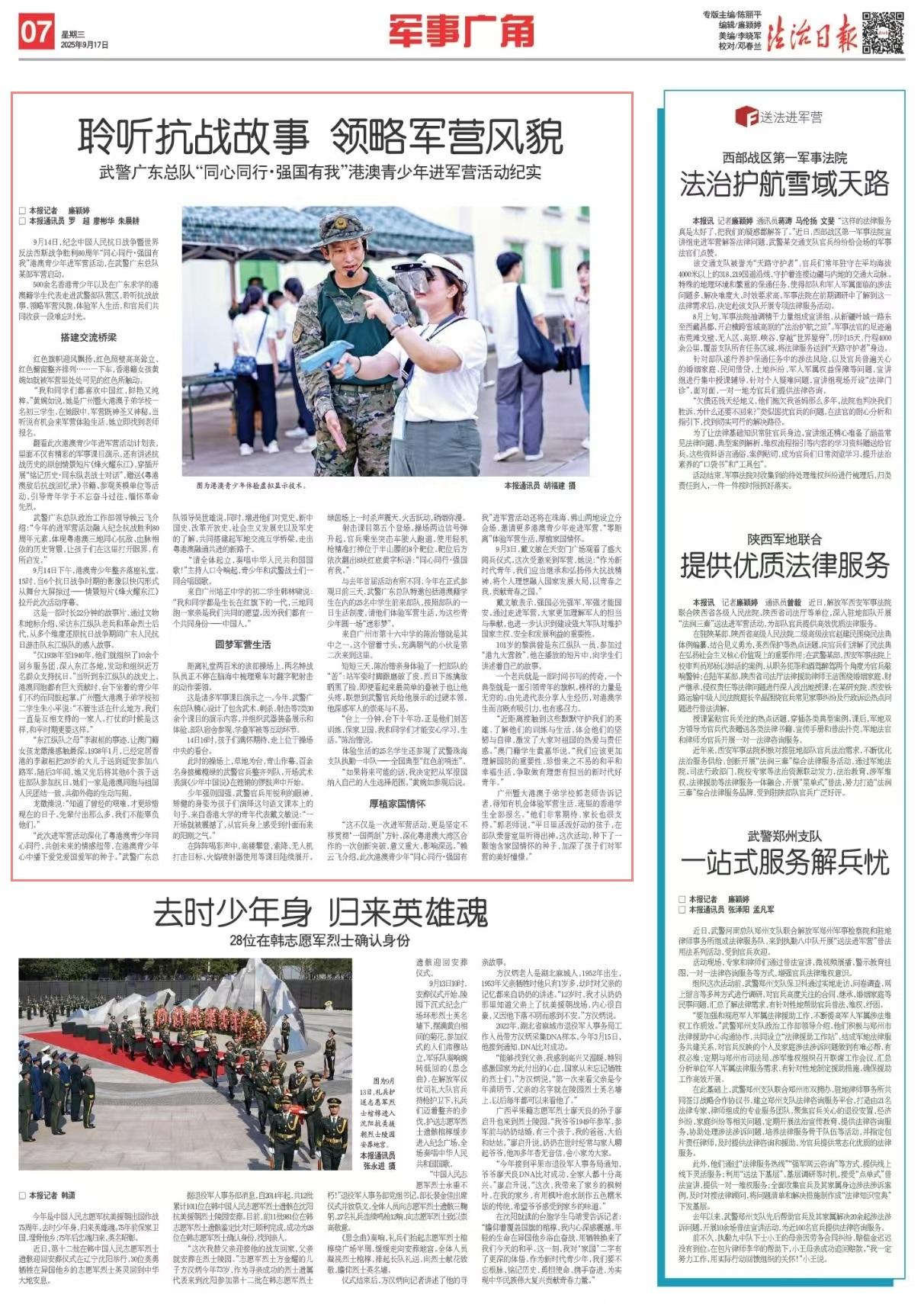9月14日,紀(jì)念中國人民抗日戰(zhàn)爭暨世界反法西斯戰(zhàn)爭勝利80周年“同心同行·強國有我”港澳青少年進軍營活動,在武警廣東總隊某部軍營啟動。
