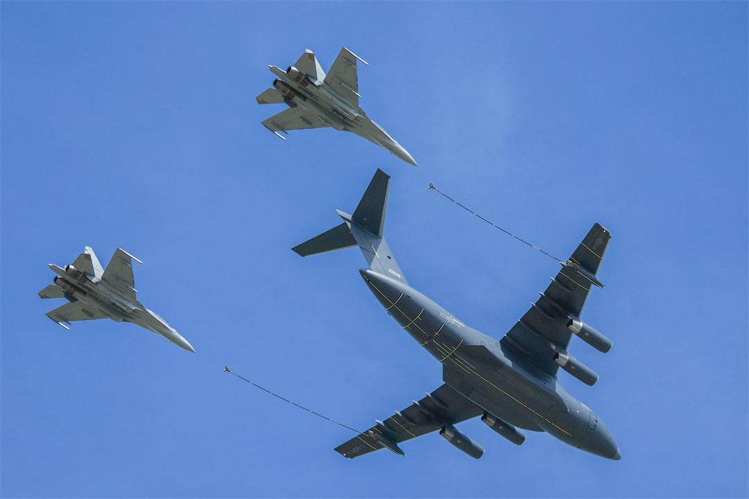 圖為運(yùn)油-20A和殲-16編隊(duì)通場(chǎng)。顏麟蘊(yùn) 攝
