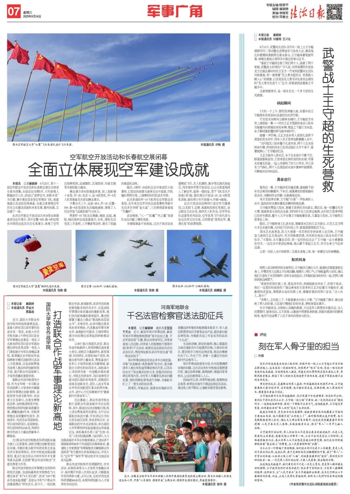聯(lián)合作戰(zhàn)學(xué)院優(yōu)化軍事理論布局和科研范式創(chuàng)新,加速構(gòu)建具有學(xué)院特色“5大理論體系”和“6大項目群”,抓實“100個聯(lián)合作戰(zhàn)實驗課題”、百部叢書和“5個聯(lián)合作戰(zhàn)基礎(chǔ)理論”研究攻關(guān)。前不久,一批反映聯(lián)合作戰(zhàn)、新域新質(zhì)、前沿科技的教材教程配發(fā)到學(xué)員手中,這是該院軍事理論體系建設(shè)的最新成果。他們依托新組建的智庫團隊,集全院智慧力量合力推出“聯(lián)戰(zhàn)勝戰(zhàn)百部叢書”。專家評價,此舉對推出更多具有我軍特色、代表最高軍事學(xué)府水平、體現(xiàn)新時代要求、引領(lǐng)軍事發(fā)展方向的理論成果起到積極推動作用。