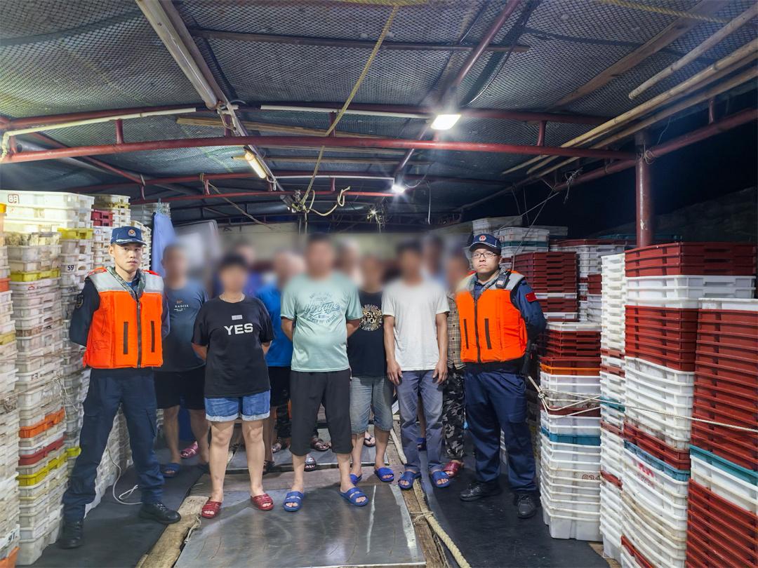 圖為漁船伏季休漁期頂風(fēng)作案,陽(yáng)江海警全力追擊,現(xiàn)場(chǎng)查獲漁獲物2萬(wàn)余斤,海警執(zhí)法員控制涉案人員。