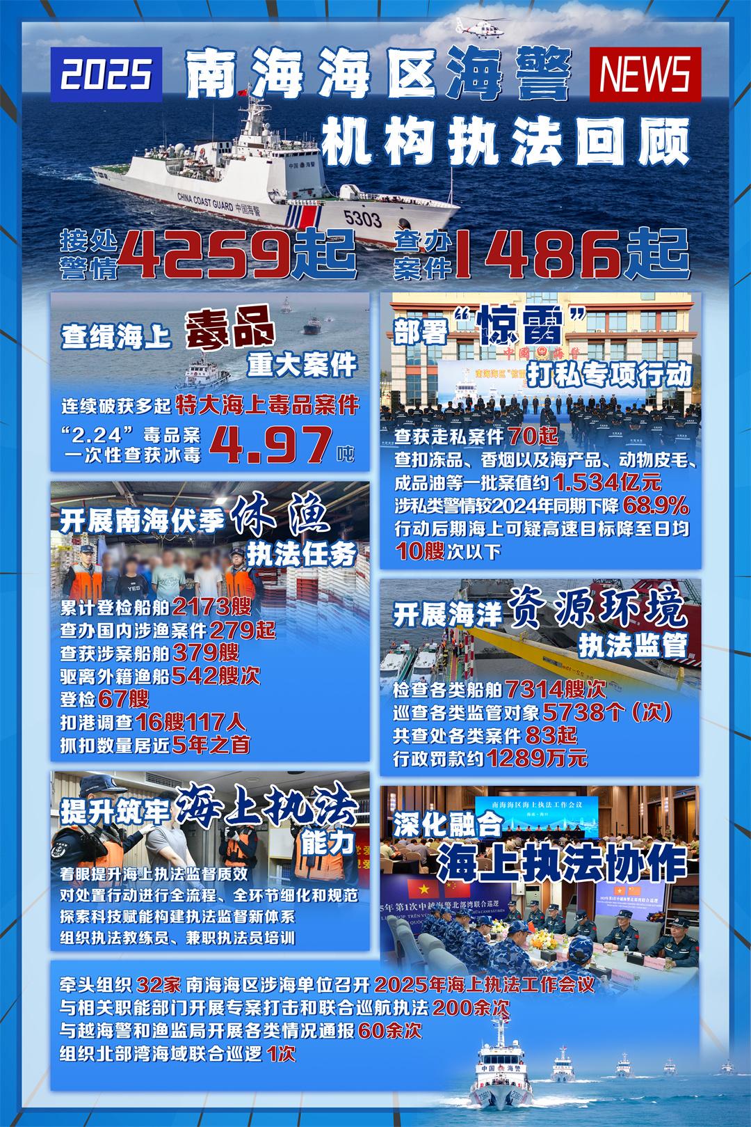 2025年,該局先后牽頭組織廣東、廣西、海南三省(區(qū))各級(jí)海警機(jī)構(gòu),開(kāi)展“驚雷”“凈?!薄氨毯!薄矮B獵”、伏季休漁等各項(xiàng)綜合執(zhí)法任務(wù),累計(jì)接處警情4259起,同比下降19.5%,查辦各類(lèi)案件1486起,同比上升0.9%,以實(shí)際行動(dòng)書(shū)寫(xiě)新時(shí)代南海海區(qū)執(zhí)法工作嶄新答卷。