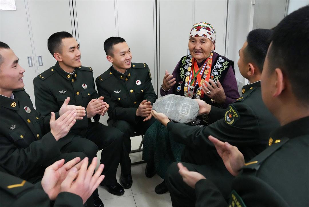 圖為“人民楷模”布茹瑪汗·毛勒朵向戰(zhàn)士們講述“中國(guó)石”的故事。