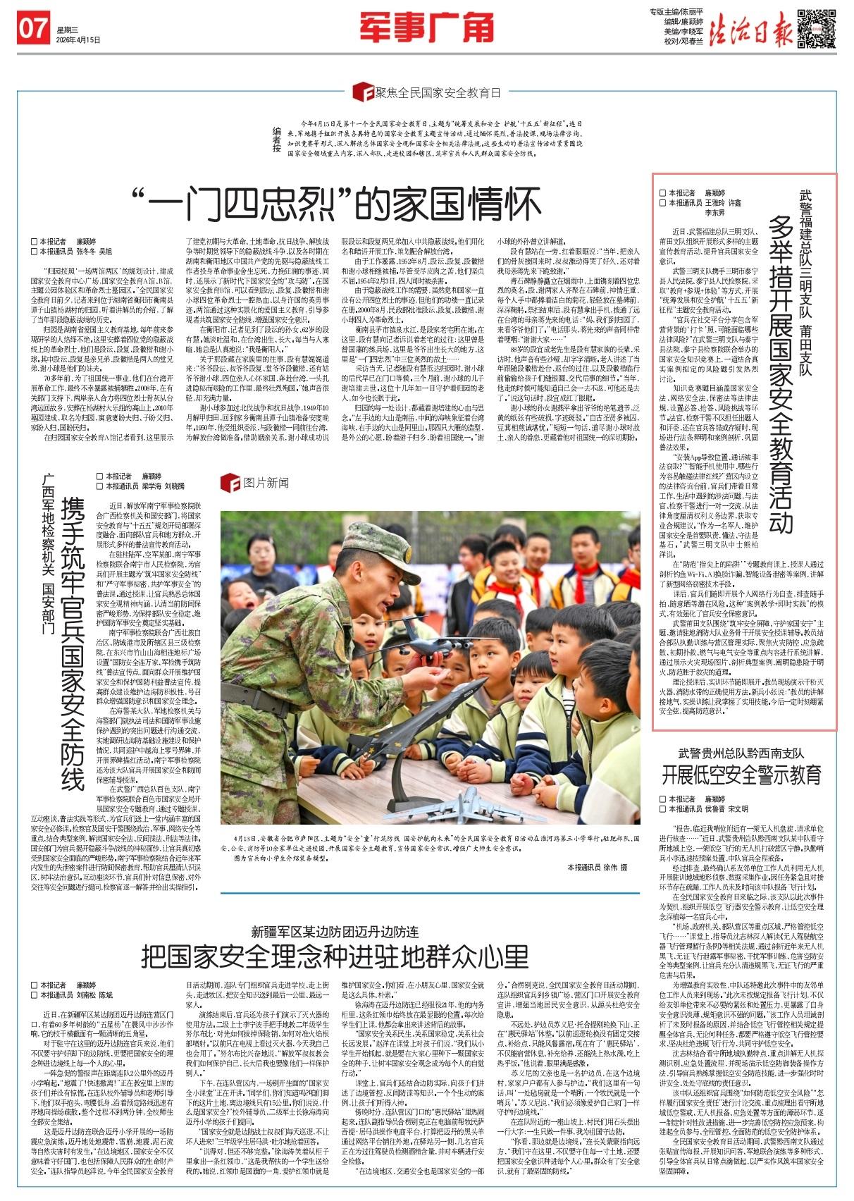 圖為支隊(duì)聯(lián)合駐地有關(guān)單位共同舉辦全民國(guó)家安全教育日宣講活動(dòng),進(jìn)一步提高國(guó)家安全意識(shí)和安全責(zé)任意識(shí)。王康漢 攝