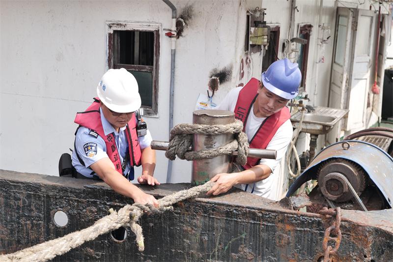 在強化船舶安全保障的基礎上,中山邊檢站聚焦口岸重點區(qū)域防御,組織執(zhí)勤警力深入口岸限定區(qū)域、集裝箱堆場、碼頭作業(yè)區(qū)等關鍵部位開展拉網式排查。民警們對防風設施、排水系統、電路設備等進行細致檢查,及時督促整改松動廣告牌、積水隱患點等問題,協助碼頭企業(yè)加固易受風雨影響的物資設備,從源頭降低事故風險。依托船訊網、智能監(jiān)控系統等科技平臺,邊檢站同步開展“線上”動態(tài)監(jiān)管,實時核查口岸及錨地船舶軌跡,嚴密防范臺風期間可能出現的非法出入境、擅自搭靠、違規(guī)上下輪等違法違規(guī)行為,確保特殊天氣下口岸管控不松懈。