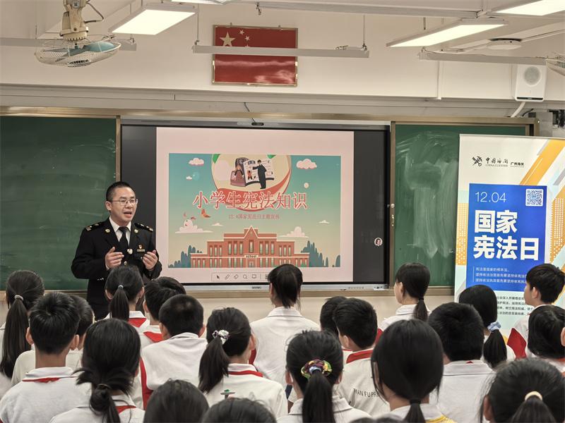 12月3日下午,在位于廣東省廣州市天河區(qū)的天府路小學建業(yè)校區(qū)內(nèi),兩個六年級班級的共90多名學生正在聆聽一場內(nèi)容豐富、形式生動的憲法宣傳和國門安全教育課。