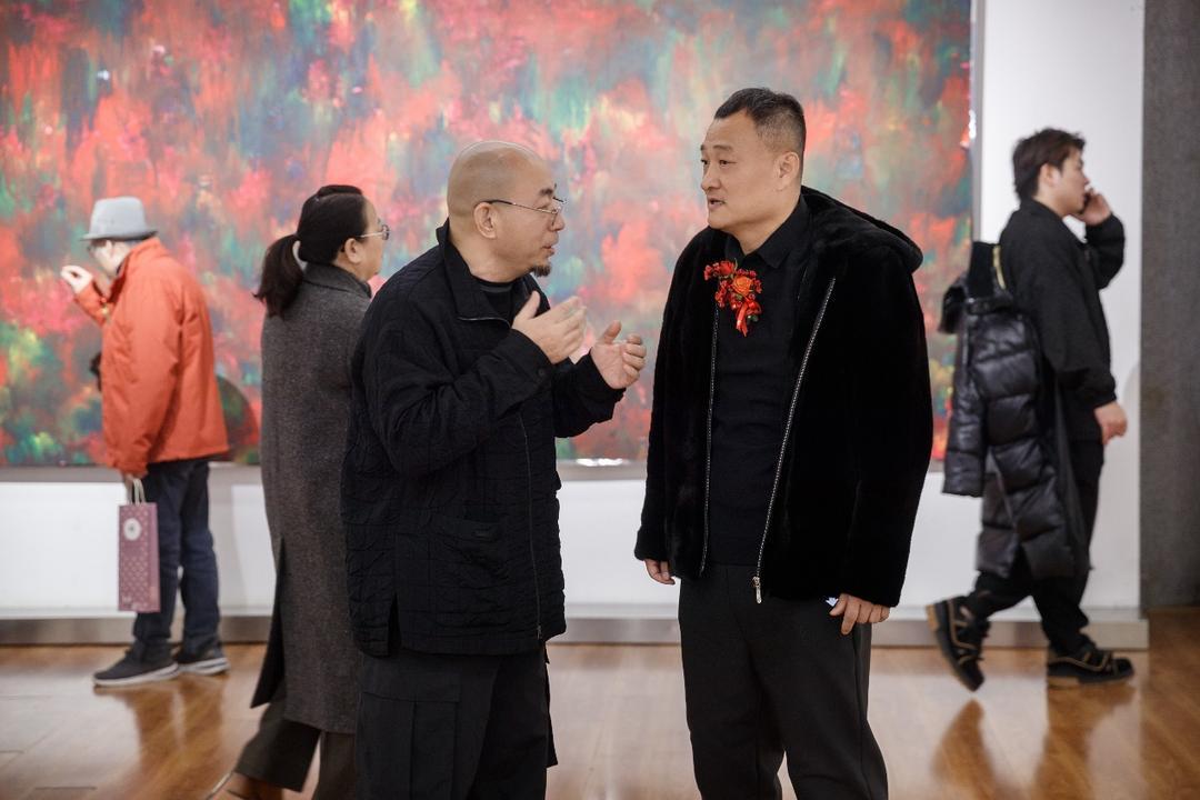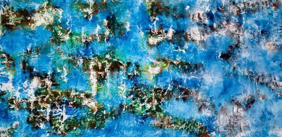這種色彩哲學(xué)與抽象主義創(chuàng)始人康定斯基的《論藝術(shù)中的精神》形成奇妙共鳴??刀ㄋ够J(rèn)為黃色具有物質(zhì)化的世俗性,藍(lán)色通向神圣的精神性,而秦樹明則在《大自然交響曲》系列中,讓靛藍(lán)與明黃如太極雙魚般糾纏共生。有一個(gè)觀眾驚嘆其潑彩張力點(diǎn)贊道:"這不就是《易經(jīng)》說的'天地氤氳,萬物化醇'嗎?"這個(gè)贊充滿道家玄機(jī):金生水,水生木,木生火,火生土,土生金——顏料在五行流轉(zhuǎn)中自會找到歸處。