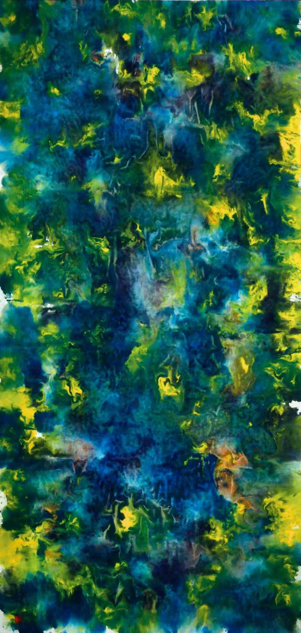 觀看道法自然展覽中秦樹明的作品,給人最大的感覺是,畫可畫,非常畫;名可名,非常名。大自然交響曲是幾十幅作品的統(tǒng)稱,每幅作品看似是中國畫,卻不是普通的中國畫,是秦樹明自創(chuàng)的潑彩畫,畫并沒有具體的名稱,也很難用具體的名稱來概括作品的意境,正可謂名可名,非常名。