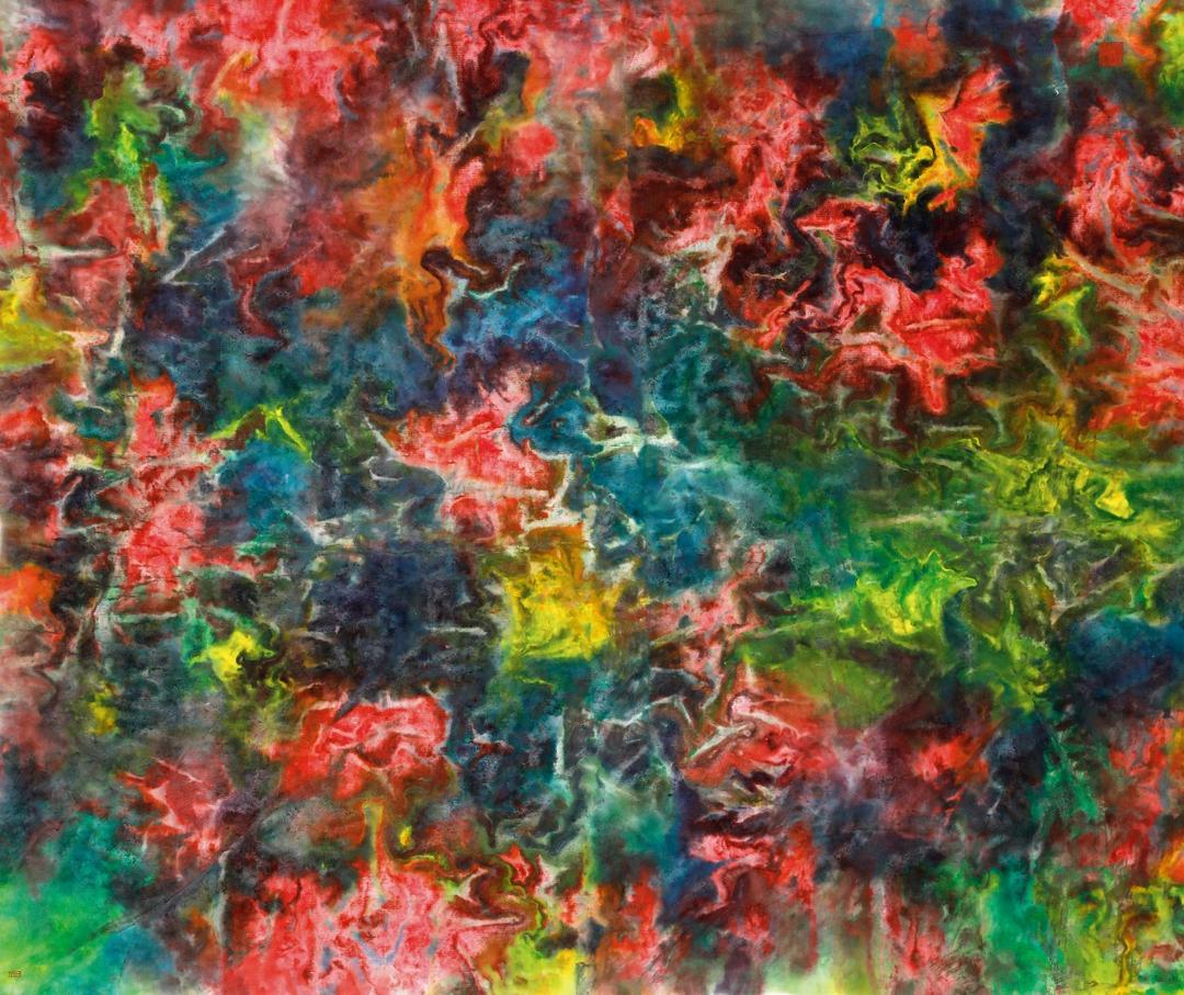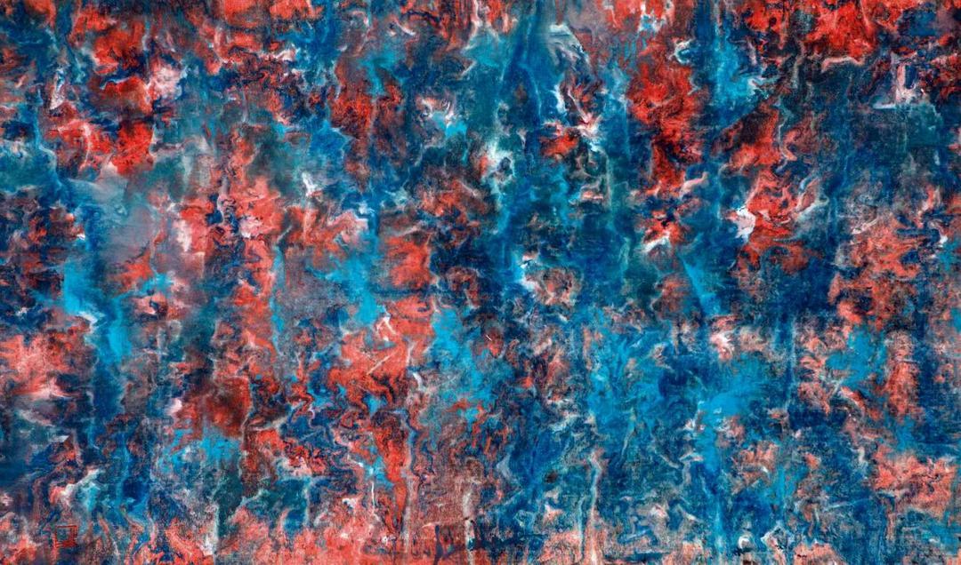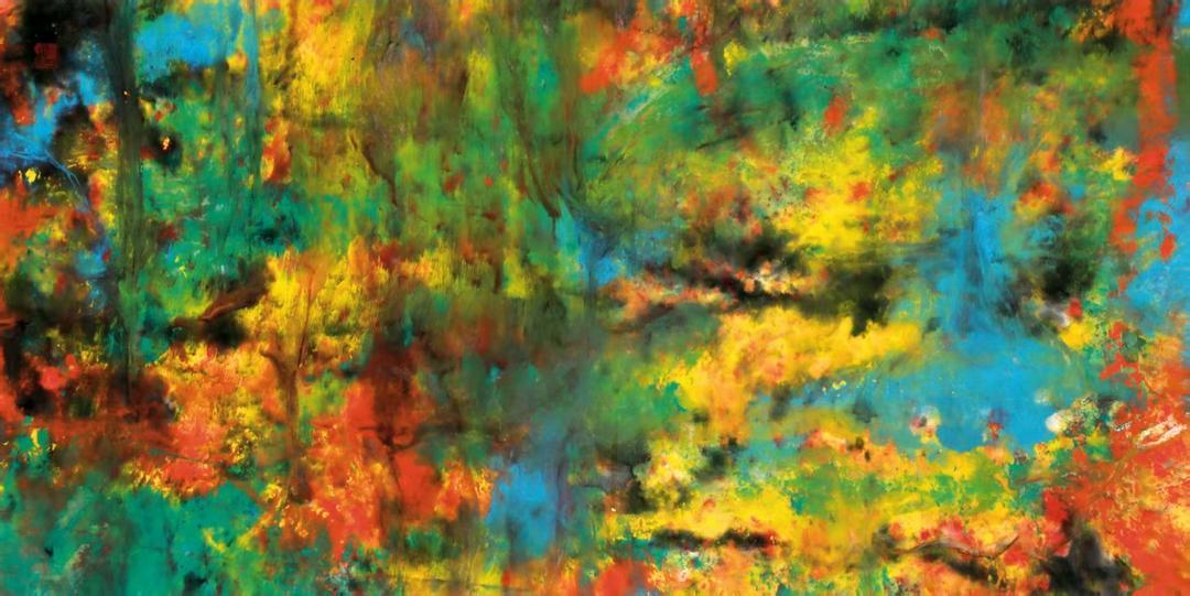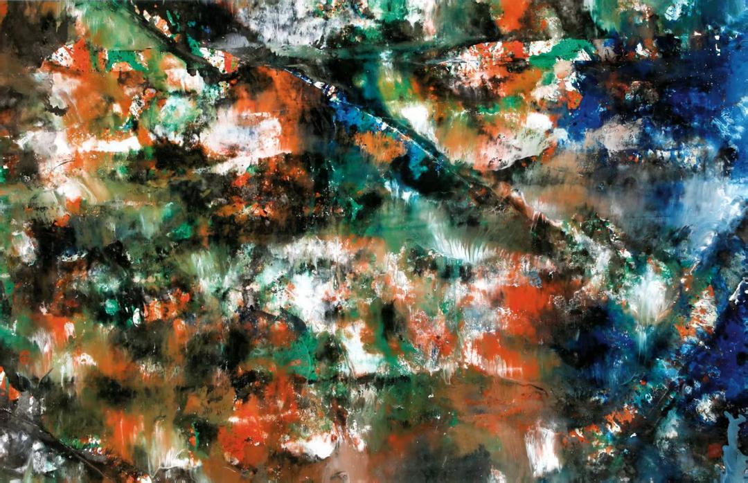 巨幅畫面好像山河在色彩中燃燒,仿佛被卷入一場天地初開的原始狂歡。這里沒有文人畫里清冷的孤峰與寂寥的松影,取而代之的,是一片被火焰吻過的山河——橙黃的熾熱巖漿在畫布上奔涌,翠綠的冷冽溪流于裂隙間穿梭,每一寸肌理都在震顫,每一道筆觸都在燃燒。在這片熾烈的色彩風(fēng)暴里,隱藏著東方美學(xué)的基因密碼。橙紅讓人想起良渚玉琮的灼目血沁,翠綠暗合越窯青瓷的雨過天青;飛白的筆觸是王維“空山新雨后”的詩意轉(zhuǎn)譯,肌理的堆疊則呼應(yīng)著宋代哥窯“金絲鐵線”的殘缺美學(xué)??梢愿杏X到中國畫的顏色與宣紙紋理記憶的相互撕扯,波洛克的行動繪畫節(jié)奏嫁接上范寬《溪山行旅圖》的磅礴氣韻。這是畫家以色彩為咒語,召喚出的一個(gè)既陌生又本真的自然魂魄。