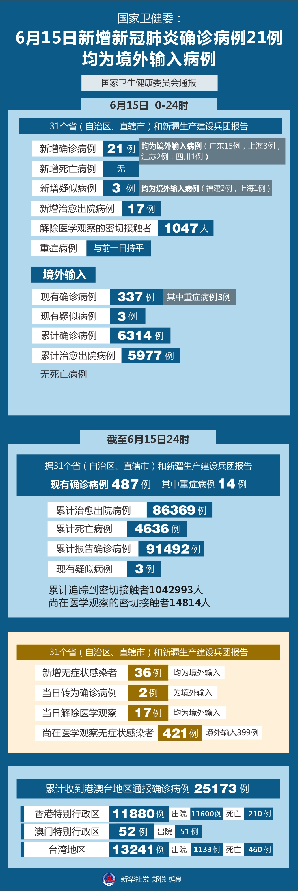 圖表:國家衛(wèi)健委:6月15日新增新冠肺炎確診病例21例 均為境外輸入病例