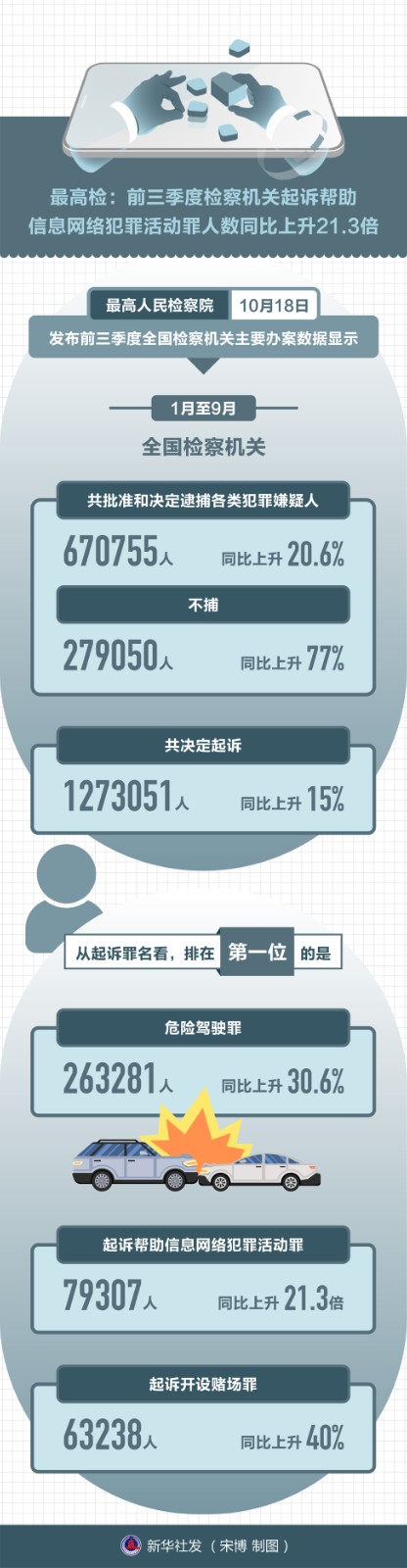 最高人民檢察院10月18日發(fā)布前三季度全國檢察機(jī)關(guān)主要辦案數(shù)據(jù)顯示,1月至9月,全國檢察機(jī)關(guān)共批準(zhǔn)和決定逮捕各類犯罪嫌疑人670755人,同比上升20.6%,不捕279050人,同比上升77%;共決定起訴1273051人,同比上升15%。