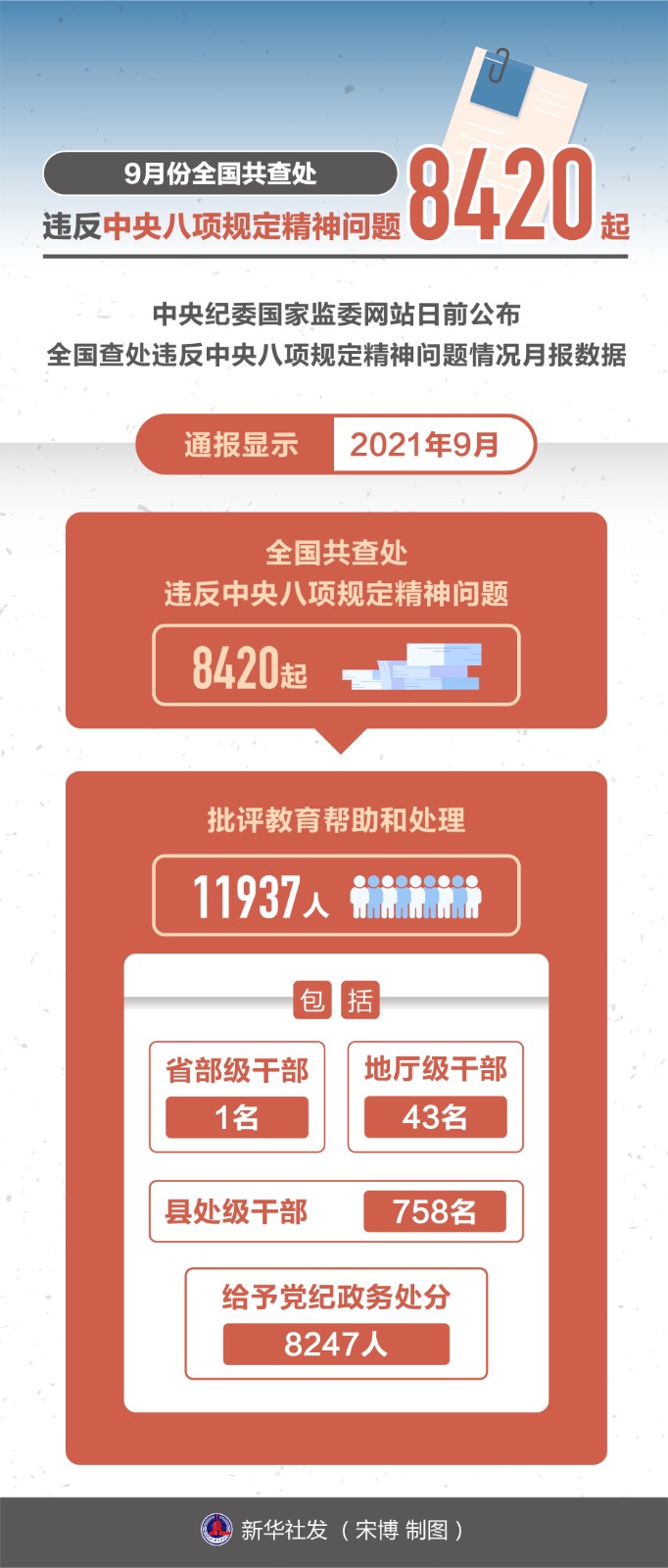 中央紀委國家監(jiān)委網站日前公布全國查處違反中央八項規(guī)定精神問題情況月報數(shù)據(jù)。通報顯示,2021年9月,全國共查處違反中央八項規(guī)定精神問題8420起,批評教育幫助和處理11937人(包括1名省部級干部、43名地廳級干部、758名縣處級干部),給予黨紀政務處分8247人。