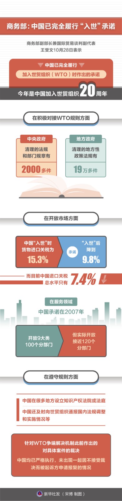 商務(wù)部副部長(zhǎng)兼國(guó)際貿(mào)易談判副代表王受文10月28日表示,中國(guó)已完全履行加入世貿(mào)組織(WTO)時(shí)作出的承諾,WTO幾任總干事及大部分WTO成員都對(duì)此給予充分肯定和普遍認(rèn)可。