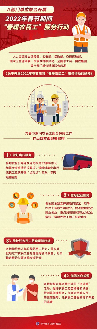 人力資源社會(huì)保障部、公安部、民政部、交通運(yùn)輸部、國(guó)家衛(wèi)生健康委、國(guó)家鄉(xiāng)村振興局、全國(guó)總工會(huì)、國(guó)鐵集團(tuán)等八部門(mén)單位近日聯(lián)合印發(fā)《關(guān)于開(kāi)展2022年春節(jié)期間“春暖農(nóng)民工”服務(wù)行動(dòng)的通知》,對(duì)春節(jié)期間農(nóng)民工服務(wù)保障工作作出四方面部署安排。