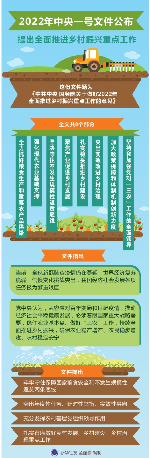 這份文件題為《中共中央 國務(wù)院關(guān)于做好2022年全面推進鄉(xiāng)村振興重點工作的意見》,全文共8個部分,包括:全力抓好糧食生產(chǎn)和重要農(nóng)產(chǎn)品供給、強化現(xiàn)代農(nóng)業(yè)基礎(chǔ)支撐、堅決守住不發(fā)生規(guī)模性返貧底線、聚焦產(chǎn)業(yè)促進鄉(xiāng)村發(fā)展、扎實穩(wěn)妥推進鄉(xiāng)村建設(shè)、突出實效改進鄉(xiāng)村治理、加大政策保障和體制機制創(chuàng)新力度、堅持和加強黨對“三農(nóng)”工作的全面領(lǐng)導(dǎo)。
