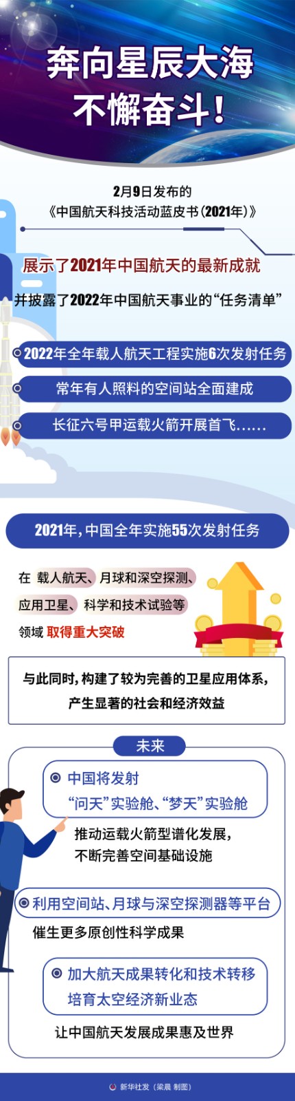 2022年全年載人航天工程實施6次發(fā)射任務(wù),常年有人照料的空間站全面建成,長征六號甲運載火箭開展首飛……2月9日發(fā)布的《中國航天科技活動藍皮書(2021年)》,展示了2021年中國航天的最新成就,并披露了2022年中國航天事業(yè)的“任務(wù)清單”,一項項舉世矚目的成就和新計劃催人奮進。