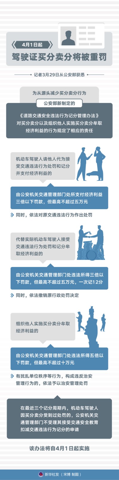 記者3月29日從公安部獲悉,為從源頭減少買分賣分行為,公安部新制定的《道路交通安全違法行為記分管理辦法》對買分賣分以及組織他人實施買分賣分牟取經(jīng)濟利益的行為規(guī)定了相應(yīng)的責任。該辦法將自4月1日起實施。
