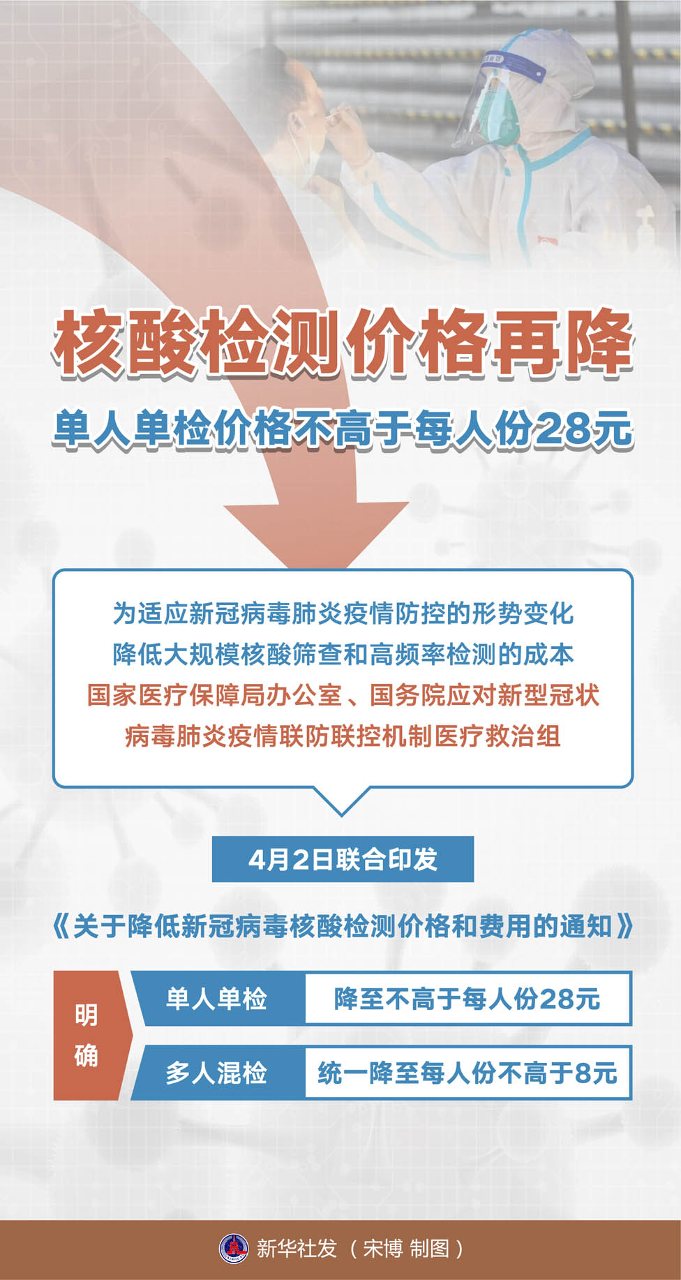 為適應(yīng)新冠病毒肺炎疫情防控的形勢(shì)變化,降低大規(guī)模核酸篩查和高頻率檢測(cè)的成本,國(guó)家醫(yī)療保障局辦公室、國(guó)務(wù)院應(yīng)對(duì)新型冠狀病毒肺炎疫情聯(lián)防聯(lián)控機(jī)制醫(yī)療救治組4月2日聯(lián)合印發(fā)《關(guān)于降低新冠病毒核酸檢測(cè)價(jià)格和費(fèi)用的通知》,明確單人單檢降至不高于每人份28元、多人混檢統(tǒng)一降至每人份不高于8元。