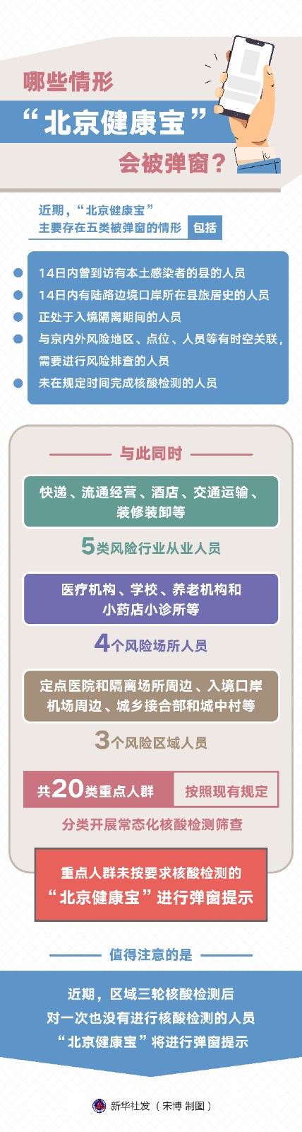 近期,“北京健康寶”主要存在五類被彈窗的情形,包括14日內(nèi)曾到訪有本土感染者的縣的人員;14日內(nèi)有陸路邊境口岸所在縣旅居史的人員;正處于入境隔離期間的人員;與京內(nèi)外風險地區(qū)、點位、人員等有時空關聯(lián),需要進行風險排查的人員;未在規(guī)定時間完成核酸檢測的人員。