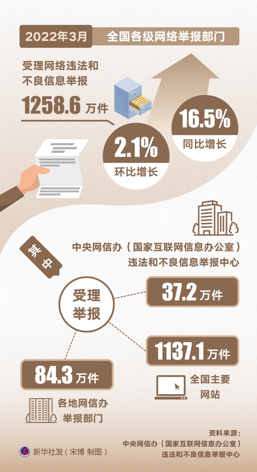 中央網(wǎng)信辦(國家互聯(lián)網(wǎng)信息辦公室)違法和不良信息舉報(bào)中心近日公布的統(tǒng)計(jì)數(shù)據(jù)顯示,今年3月,全國各級網(wǎng)絡(luò)舉報(bào)部門受理舉報(bào)1258.6萬件,環(huán)比增長2.1%、同比增長16.5%。