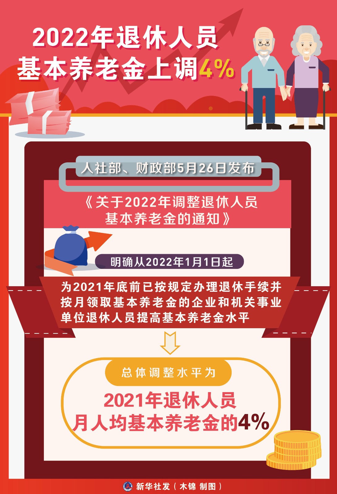 人社部、財政部5月26日發(fā)布《關(guān)于2022年調(diào)整退休人員基本養(yǎng)老金的通知》,明確從2022年1月1日起,為2021年底前已按規(guī)定辦理退休手續(xù)并按月領(lǐng)取基本養(yǎng)老金的企業(yè)和機(jī)關(guān)事業(yè)單位退休人員提高基本養(yǎng)老金水平,總體調(diào)整水平為2021年退休人員月人均基本養(yǎng)老金的4%。