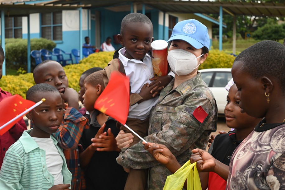 5月26日,在剛果(金)布卡武市國際SOS兒童村,中國第25批赴剛果(金)維和醫(yī)療分隊(duì)隊(duì)員開展愛心傳遞活動(dòng)。