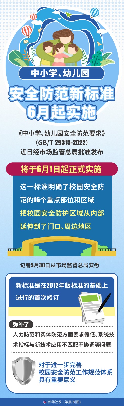 《中小學(xué)、幼兒園安全防范要求》(GB/T 29315-2022)近日經(jīng)市場(chǎng)監(jiān)管總局批準(zhǔn)發(fā)布,將于6月1日起正式實(shí)施。這一標(biāo)準(zhǔn)明確了校園安全防范的16個(gè)重點(diǎn)部位和區(qū)域,把校園安全防護(hù)區(qū)域從內(nèi)部延伸到了門口、周邊地區(qū)。