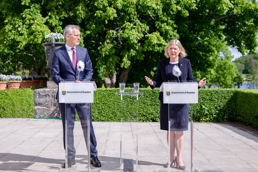 6月13日,瑞典首相安德松(右)與到訪的北約秘書長(zhǎng)斯托爾滕貝格在瑞典首都斯德哥爾摩以西約120公里的哈普松德首相夏季莊園出席新聞發(fā)布會(huì)。